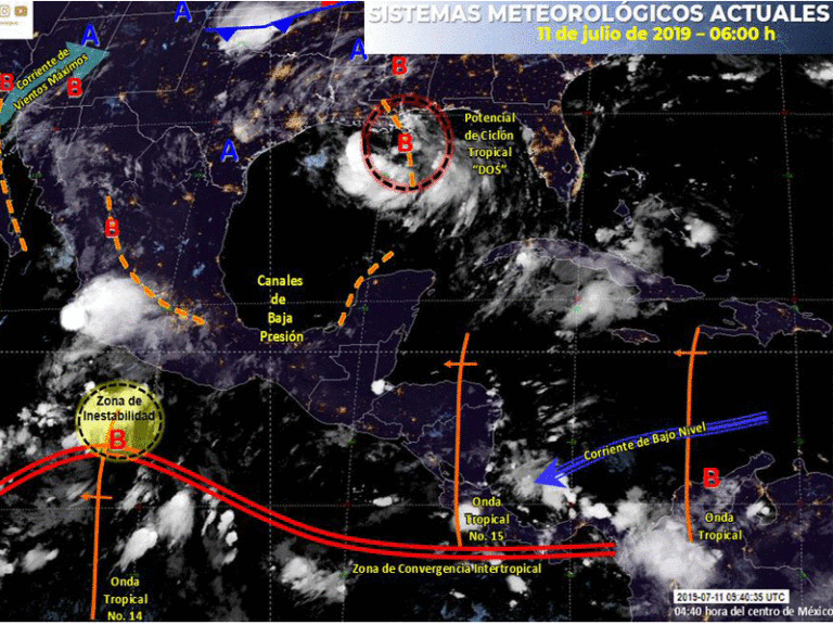 A su vez, otros canales de baja presión en el norte, centro y sureste de la República Mexicana, una zona de inestabilidad en la atmósfera superior, así como la aproximación de la nueva onda tropical número 15 a la Península de Yucatán, favorecerán el siguiente potencial de lluvias con descargas eléctricas y posible caída de granizo: