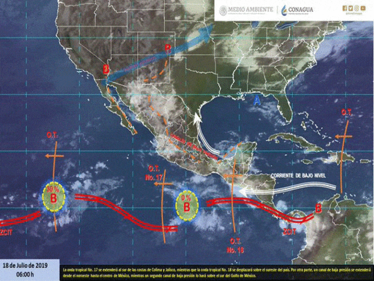 Remanentes de la onda tropical 18, localizada el sur de la Península de Yucatán provoca entrada de aire marítimo tropical con variable contenido de humedad.
