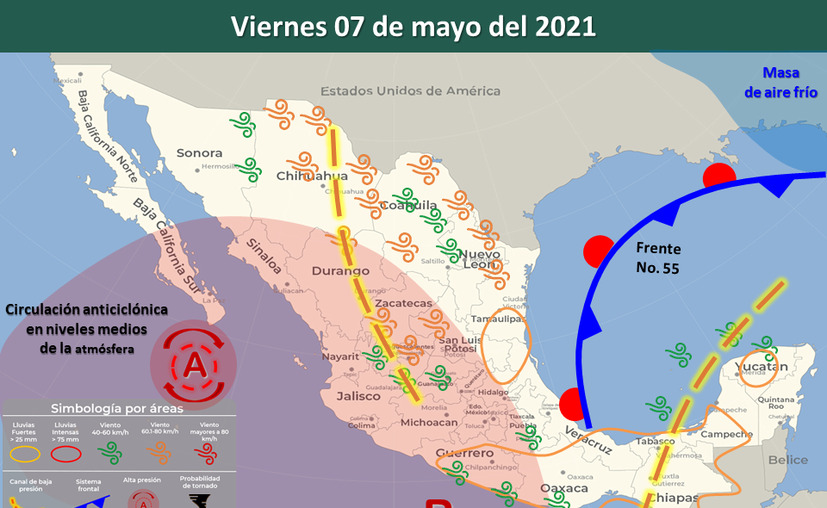 Por otro lado, el frente frío 55 se localiza en superficie y se ubica en la porción central del Golfo de México, porción media de la Península de Florida, y hasta la porción occidental del océano Atlántico del norte, se desplaza al este; generando descenso de temperaturas, nubosidad variable, así como, nubes de tormenta, con probabilidades de lluvias acompañadas de actividad eléctrica, viento frio y arrachado del norte y noroeste.