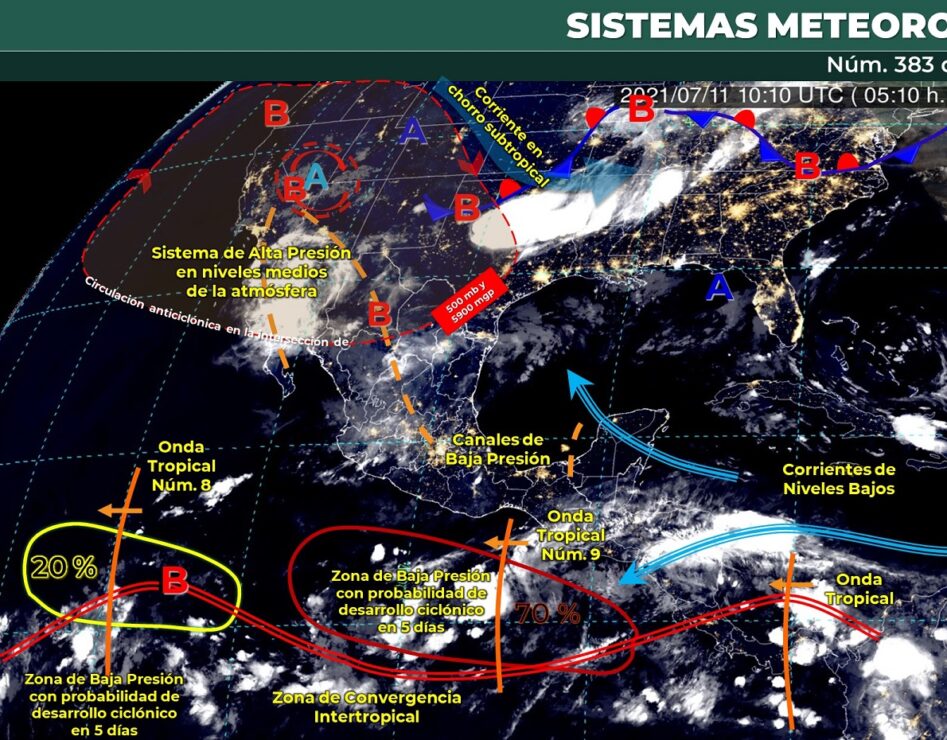 Pronóstico del clima para hoy domingo 11 de julio en Quintana Roo. Este día, un canal de baja presión se extenderá sobre el noroeste, occidente y centro del país, interaccionará con inestabilidad atmosférica superior y con el ingreso de humedad del Océano Pacífico y Golfo de México, lo que provocará chubascos y lluvias fuertes a muy fuertes, descargas eléctricas y posibles granizadas en zonas del noroeste, norte, occidente, centro y sur del territorio nacional, además de tormentas puntuales intensas en Sonora, Sinaloa y Durango. Por otra parte, la onda tropical Núm. 9 se desplazará sobre el sureste de México, originando chubascos y lluvias puntuales fuertes en dicha región, incluida la Península de Yucatán. También prevalecerá ambiente caluroso a muy caluroso en zonas del noroeste, norte y noreste de la República Mexicana, así como en la Península de Yucatán, previéndose condiciones de onda cálida con temperaturas de 45 a 50 °C en zonas de Baja California.