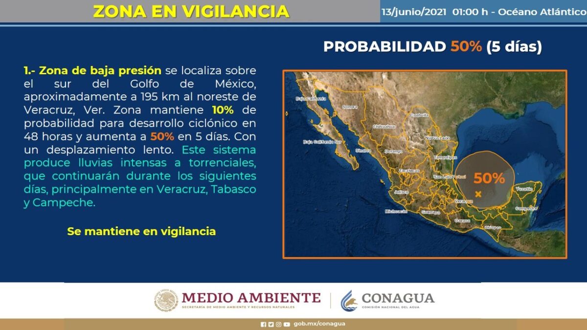 Pronóstico del clima para hoy domingo 13 de junio en Quintana Roo.- Este día, dos zonas de baja presión con probabilidad para desarrollo ciclónico, una en el Océano Pacífico al sur de las costas de Guerrero y Oaxaca, y la segunda sobre el sur del Golfo de México, ocasionan fuerte ingreso de humedad de dichos litorales hacia el sur, sureste, oriente, centro y occidente del territorio nacional.