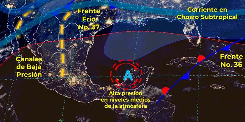 En contraste, una circulación anticiclónica en niveles medios de la atmósfera, originará incremento de la temperatura diurna, con ambiente caluroso a muy caluroso y disminución en el potencial para lluvias en gran parte del territorio nacional.
