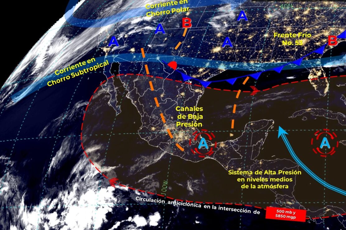 Por otro lado, el frente frío No. 53 se extenderá sobre el Golfo de México, en interacción con un canal de baja presión sobre el oriente y sureste del país, ocasionarán lluvias puntuales fuertes en Hidalgo, Puebla y Chiapas, e intervalos de chubascos en el Estado de México, Ciudad de México, Tlaxcala, Veracruz y Oaxaca.
