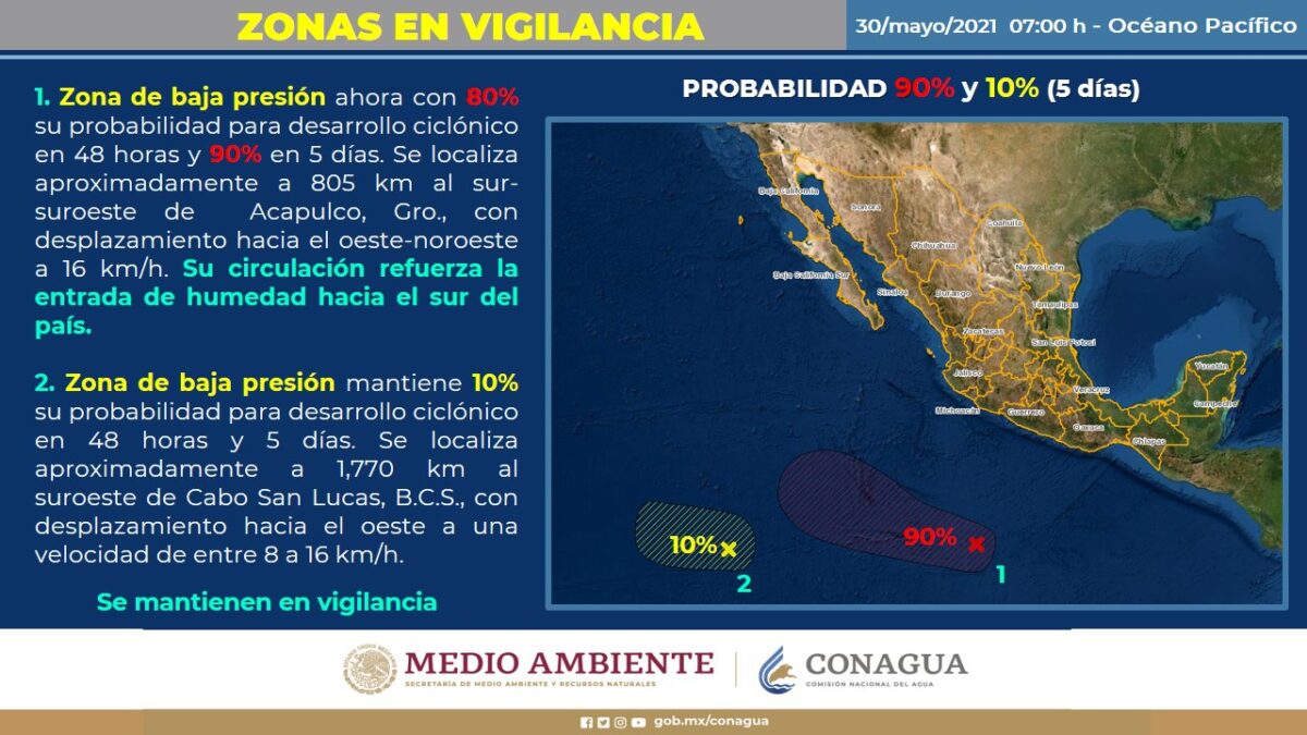 Nota: Para más información de las zonas de baja presión con probabilidad de desarrollo ciclónico en el Océano Pacífico nor-oriental, consulta los avisos de Servicio Meteorológico Nacional a través de https://smn.conagua.gob.mx/es/pronosticos/avisos/aviso-de-ciclon-tropical-en-el-oceano-pacifico