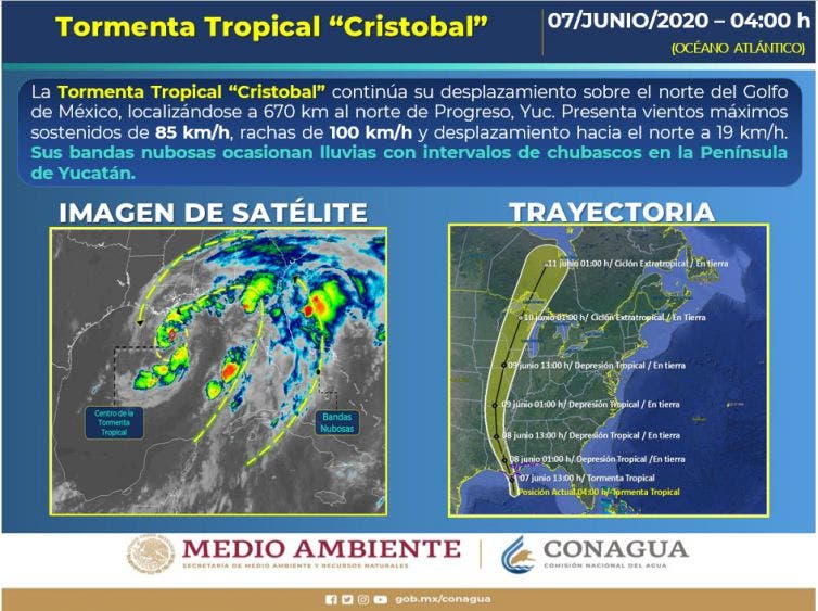 Pronóstico del clima para hoy domingo 7 de junio del 2020. Para hoy, la tormenta tropical «Cristóbal» continuará su desplazamiento sobre el Golfo de México, se prevé su ingreso a tierra por las costas de Estados Unidos durante esta tarde-noche. Sus amplias bandas nubosas ocasionarán chubascos en la Península de Yucatán.