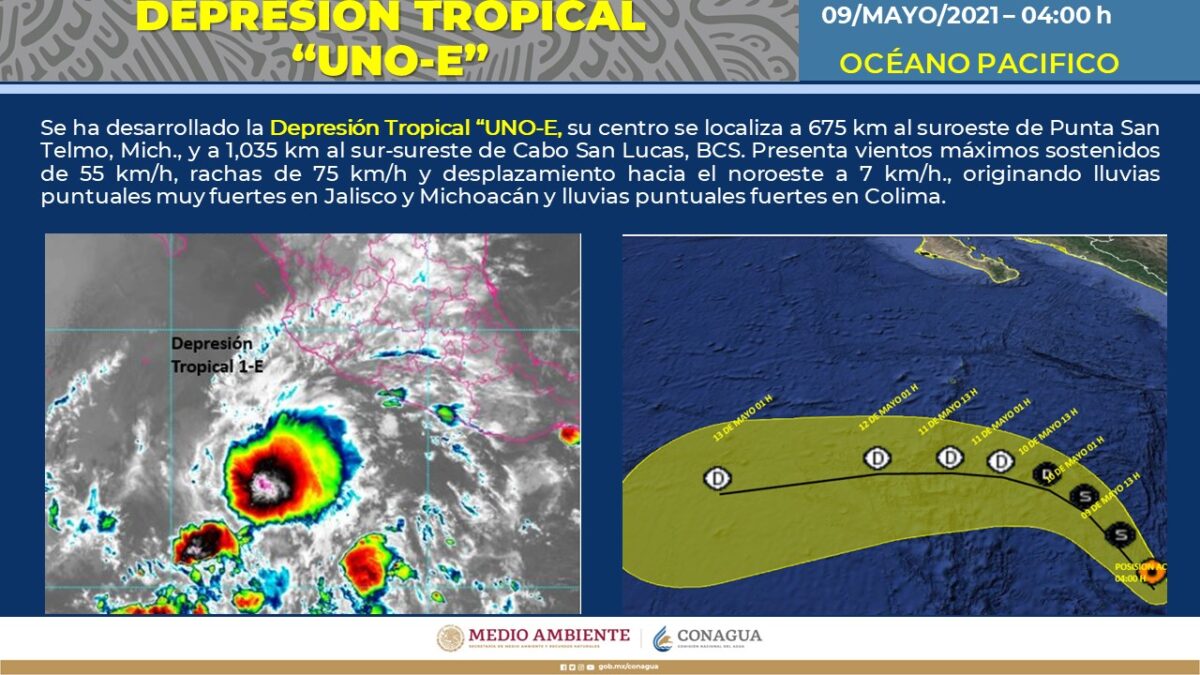 Pronóstico del clima para hoy domingo 9 de mayo de 2021. Este día, la depresión tropical UNO-E del Pacífico se localizará frente a las costas de Jalisco e incrementará la probabilidad de lluvias en el occidente, centro y sur de México, muy fuertes en Michoacán, fuertes en Jalisco y chubascos en Colima, todas acompañadas de descargas eléctricas y posible caída de granizo.