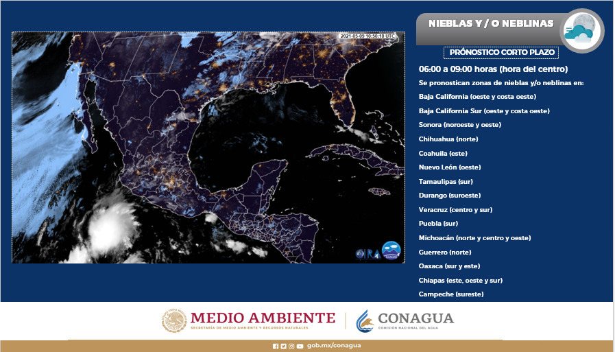Golfo de México: Cielo medio nublado a nublado con intervalos de chubascos en Veracruz y lluvias aisladas en Tamaulipas, acompañadas de descargas eléctricas. Sin lluvias en Tabasco. Ambiente fresco por la mañana con bancos de niebla en zonas serranas de Tamaulipas y Veracruz. Ambiente caluroso a muy caluroso por la tarde. Viento del sureste de 15 a 30 km/h en la región, con rachas de 60 a 70 km/h y tolvaneras en el norte de Tamaulipas, además de rachas de 50 a 60 km/h en Veracruz y Tabasco.