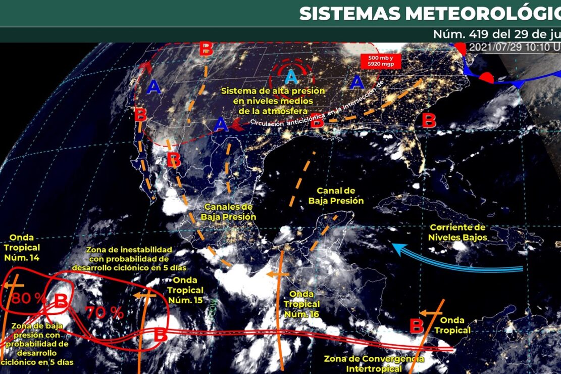 Por otra parte, la onda tropical número 16 recorrerá el sur de México; la combinación de estos sistemas ocasionarán lluvias puntuales intensas en Oaxaca y Chiapas, y lluvias puntuales muy fuertes en Sonora, Sinaloa, Guerrero, Veracruz, Tabasco y Yucatán.
