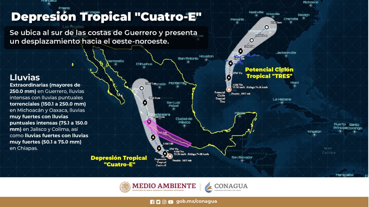 Pronóstico del clima para hoy viernes 18 de junio en Quintana Roo. Para este día, las amplias bandas nubosas del potencial ciclón tropical «Tres» localizado en el Golfo de México y con desplazamiento hacia el norte, un canal de baja presión en la Península de Yucatán, la aproximación de la onda tropical No. 4 y la depresión tropical 4-E al sur de las costas de Guerrero, afectarán al territorio mexicano.