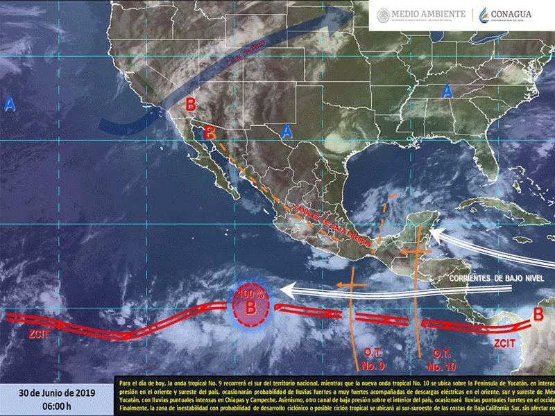 Un canal de baja presión, ubicado sobre el Golfo de México, al norte de la Península de Yucatán, en su amplia circulación periférica impulsan aire marítimo tropical con moderado contenido de humedad del mar Caribe, interactúa con una onda tropical localizada en la porción oriental, favorecen la permanencia de temperaturas calurosas, nubosidad, lluvias y chubascos acompañados de actividad eléctrica dispersa sobre toda la zona peninsular.