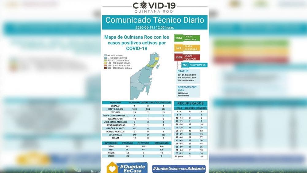 Quintana Roo con 20 nuevos casos y 7 defunciones por COVID 19.- Quintana Roo reporta al corte de este 19 de mayo 20 casos nuevos de COVID 19, así como 7 defunciones más por esta causa la mayoría de ellas en Benito Juárez, mientras que JMM reporta un 100% de mortandad en los 3 contagios registrados en este municipio.