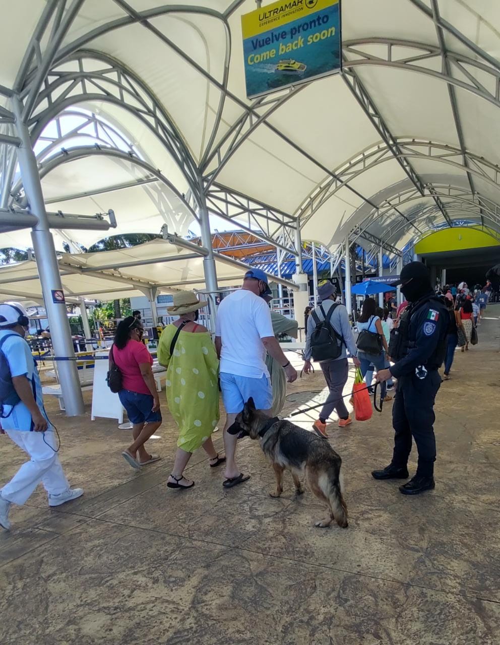 Por lo anterior la Secretaría de Seguridad Pública de Quintana Roo, a través de la Unidad Canina K9, supervisa el uso de cubrebocas y sana distancia; en muelles y terminales de autobuses del estado.