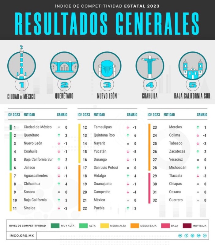 El Estado de Quintana Roo fue el Estado que más avanzó por su desempeño económico, inversión en infraestructura, eficiencia en gobierno, innovación, medio ambiente e inclusión, publicó el Índice de Competitividad Estatal (ICE) 2023, elaborado por el Instituto Mexicano para la Competitividad (IMCO).