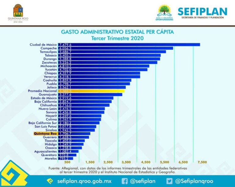 Para el tercer trimestre de 2020, Quintana Roo se posicionó en el octavo lugar entre las entidades con menor carga administrativa per cápita con un gasto administrativo de mil 706.7 pesos por persona.