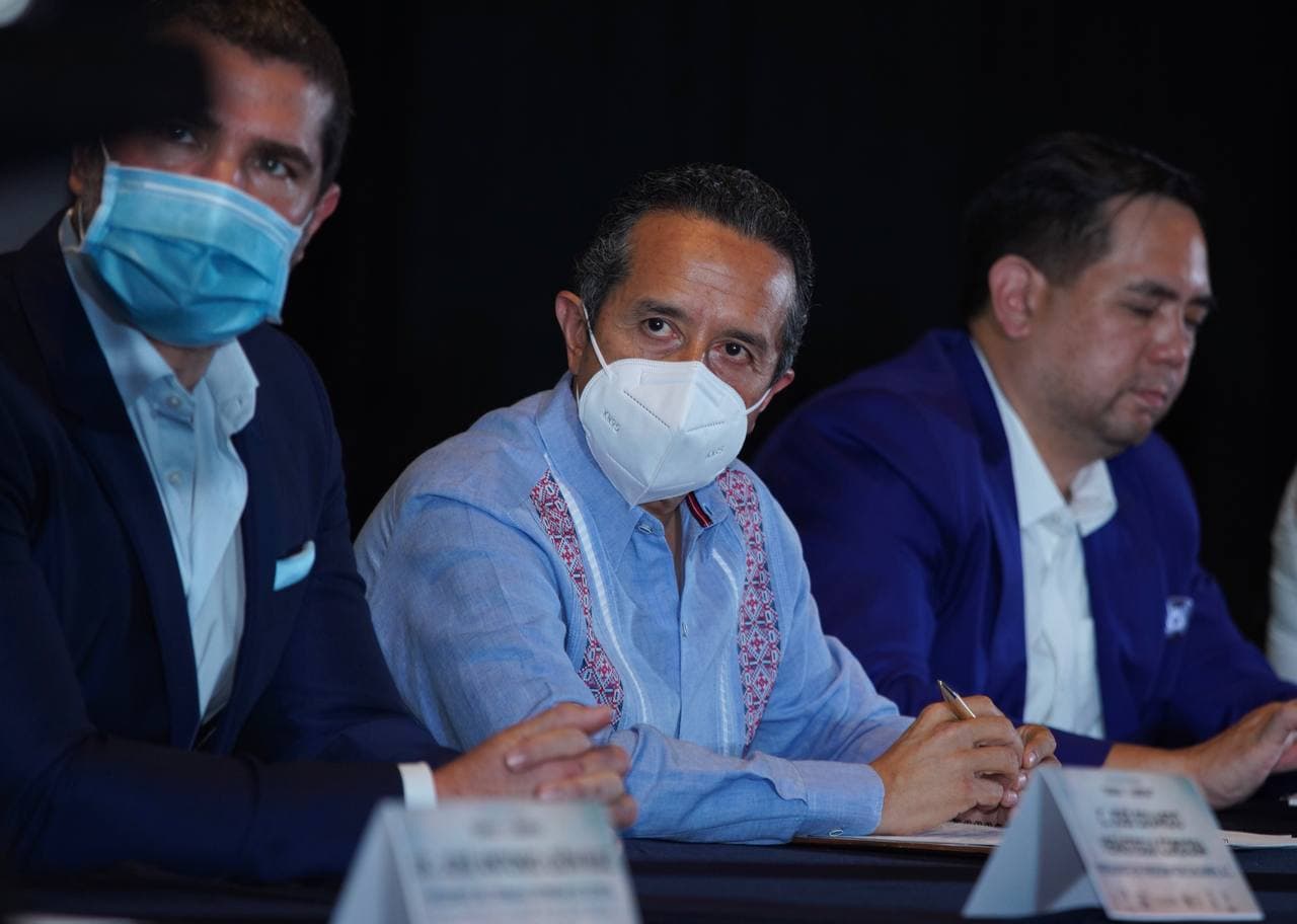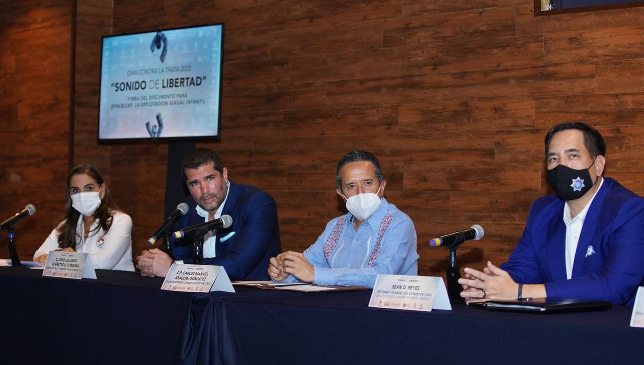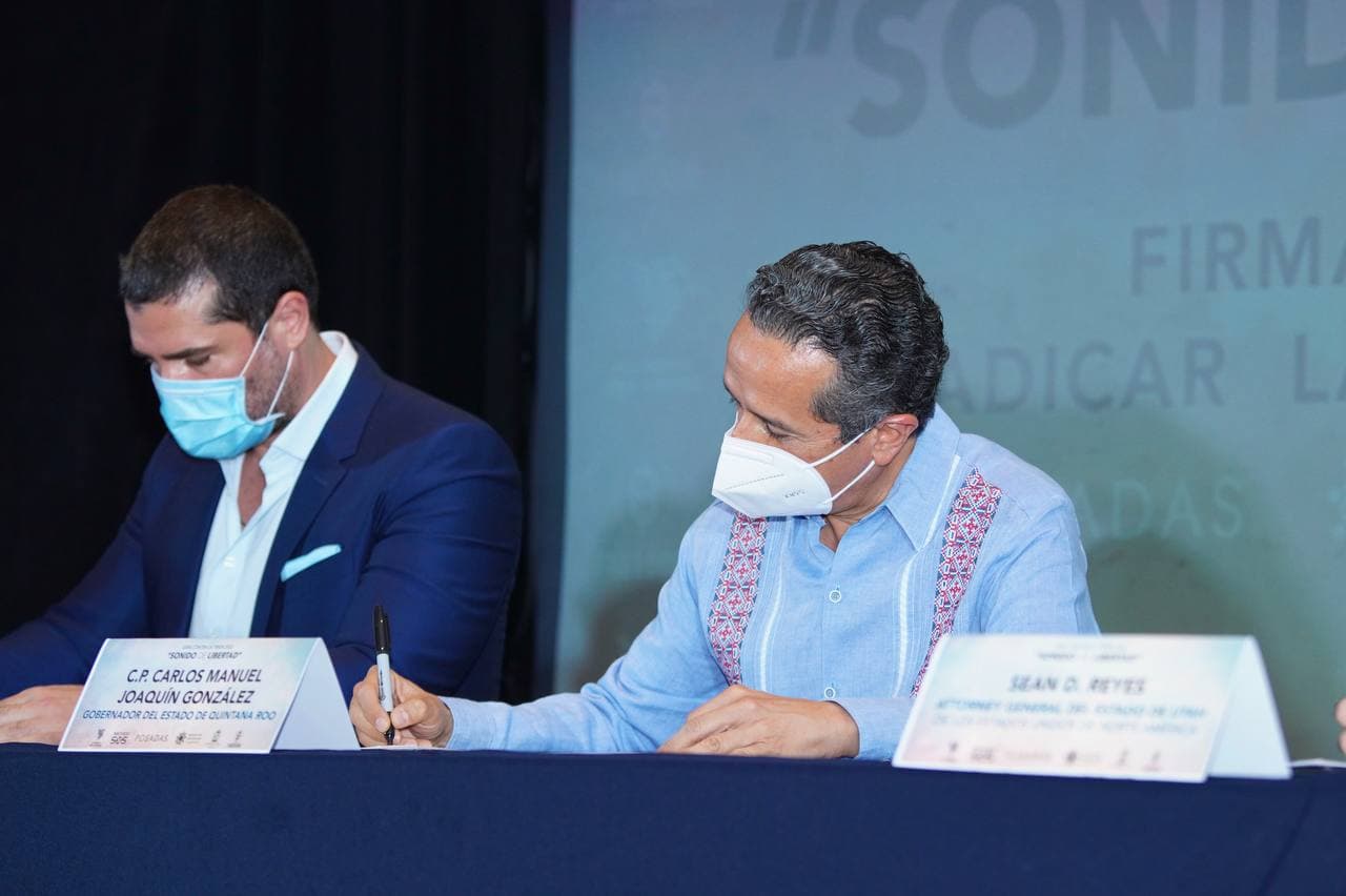 El titular del Ejecutivo firmó el documento con Eduardo Verástegui, presidente del movimiento “Viva México”; el fiscal general de Utah, Estados Unidos, Sean Reyes; José Antonio León Ruíz, presidente del Tribunal Superior de Justicia y del Consejo de la Judicatura; la diputada Euterpe Gutiérrez Valasis, en representación de la XVI Legislatura del Congreso del estado; el Fiscal General de Quintana Roo, Óscar Montes de Oca y Mara Lezama, presidenta municipal de Benito Juárez.