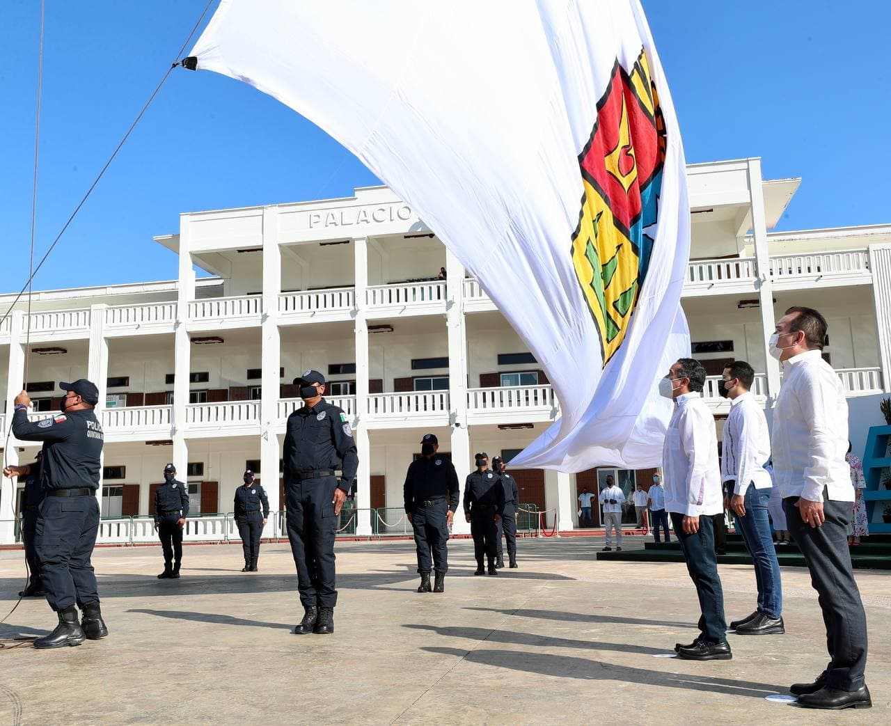 Por la mañana, el titular del Ejecutivo encabezó el izamiento de la bandera de Quintana Roo en el asta monumental ubicado en la explanada frente al Palacio de Gobierno.