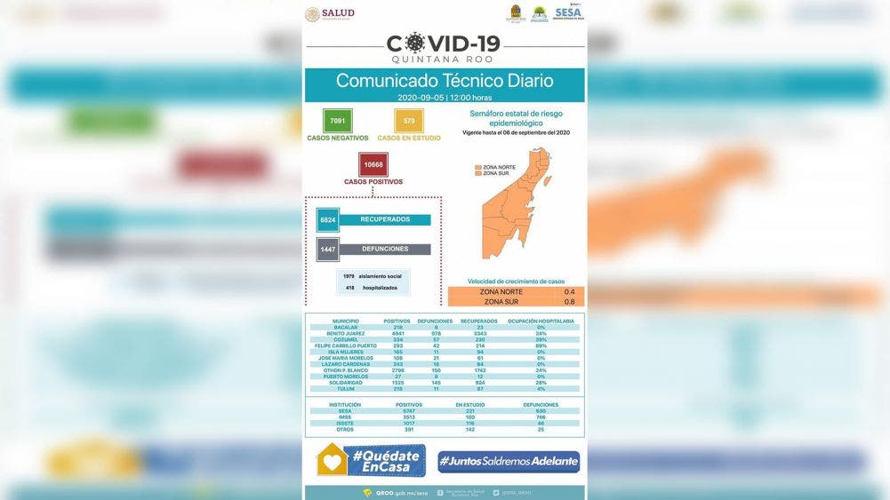 Igualmente, se añaden al funesto conteo de decesos, once muertes mas, para llegar a un total de mil 447 víctimas mortales del virus, es importante señalar, que la mayoría tanto de contagios como de fallecimientos se acumulan precisamente en Benito Juarez Cancún, principal municipio de la zona norte de Quintan Roo.