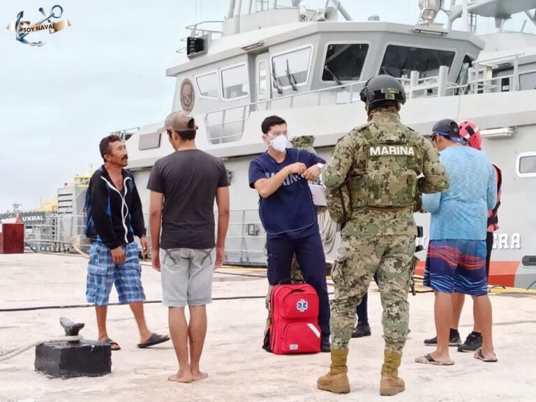 Por lo anterior y con el fin de salvaguardar la vida humana en la mar, zarpó inmediatamente una embarcación tipo MLB de citada Estación Naval con personal especializado a bordo, quienes proporcionaron el apoyo, trasladando a la embarcación y a los tripulantes al muelle de la Quinta Región Naval, en donde fueron recibidos por personal de la Capitanía de Puerto de Isla Mujeres para realizar los trámites correspondientes.