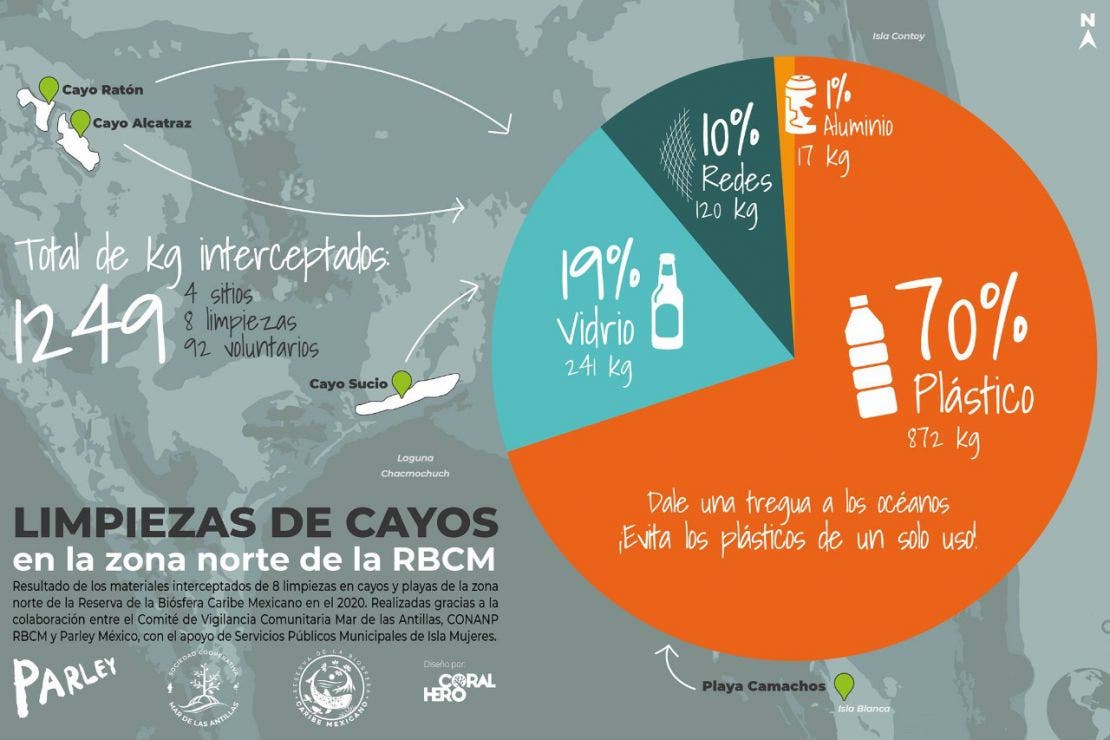 Informaron que a mediados del año pasado Conanp-RBCM, el Comité de Vigilancia Comunitaria Mar de las Antillas y Parley México iniciaron una colaboración que permitió una serie de limpiezas en los cayos de la zona norte de la Reserva de la Biosfera Caribe Mexicano e Isla Blanca, interceptando luego de 8 limpiezas, mil 249 kilogramos de residuos sólidos, en su mayoría plástico.