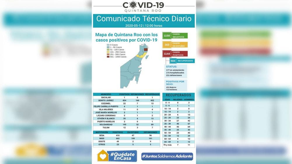Benito Juárez acumula 854 casos, 160 defunciones y 452 recuperados mientras que Solidaridad reporta 195 contagios y 32 decesos, por su parte OPB, tiene ya 35 confirmados, y 6 muertes, Cozumel, 22 contagios, y 7 defunciones, Tulum 12 casos y 3 muertes, Isla Mujeres ya tiene 11 positivos, Lázaro Cárdenas 5 y una defunción, FCP tiene 4 casos de los cuales uno ha perdido la vida, JMM se mantiene con 3 confirmados y 1 deceso, Puerto Morelos tiene 2 contagios y Bacalar uno, que ya se encuentra recuperado, por lo que no tiene casos activos.