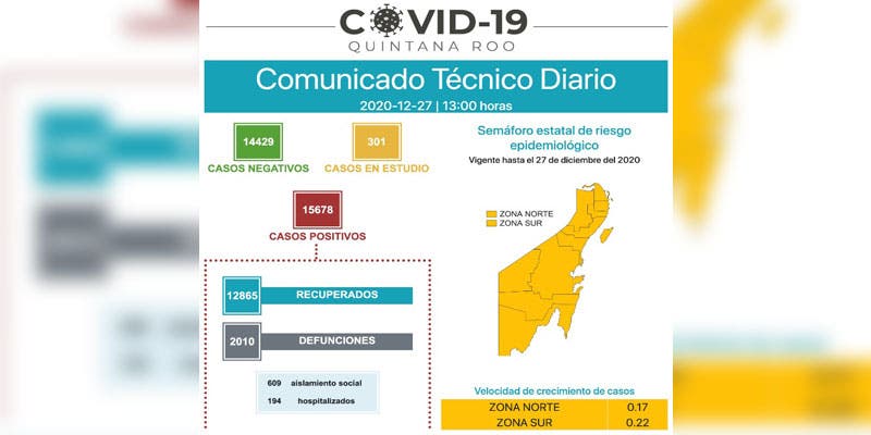 Mientras el viernes 25 de diciembre Quintana Roo tuvo una Navidad con 50 nuevos contagios registrados de Covid-19, así como dos defunciones y el 26 hubo 23 casos confirmados más, sin que ese día se reportara muertes por esta causa, ayer domingo 27 de diciembre fueron 39 positivos y 4 decesos, con lo cual la entidad se mantiene con un comportamiento relativamente estable en los últimos reportes de los Servicios Estatales de Salud.