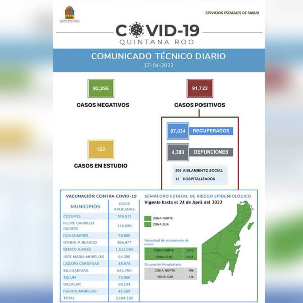 En cuanto a los esfuerzos de la campaña permanente de vacunación contra el covid-19, Sesa informó que esta se ubica hoy en 3 millones 104 mil 185 dosis aplicadas del reactivo a la población de Quintana Roo, ya que no hubo nuevas aplicaciones.