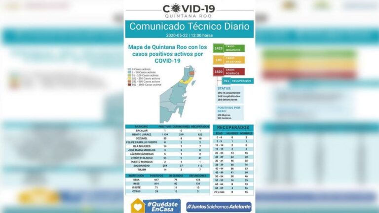 Asimismo, Othón P. Blanco 54 positivos, 9 defunciones y 21 recuperados; en Tulum 14 positivos, 3 defunciones y 7 recuperados; Felipe Carrillo Puerto cuenta con 8 casos positivos, 2 defunciones; Isla Mujeres 14 positivos, 1 deceso y 7 recuperados; José María Morelos 3 positivos.