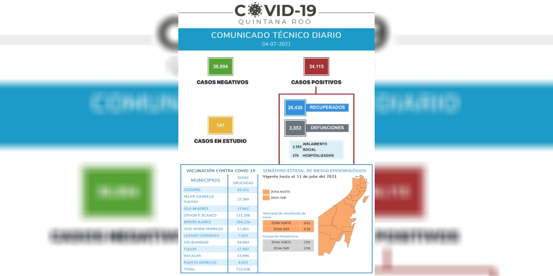 Supera Quintana Roo los 33 mil contagios de Covid-19; el fin de semana se registraron 522 nuevos casos y 14 defunciones.