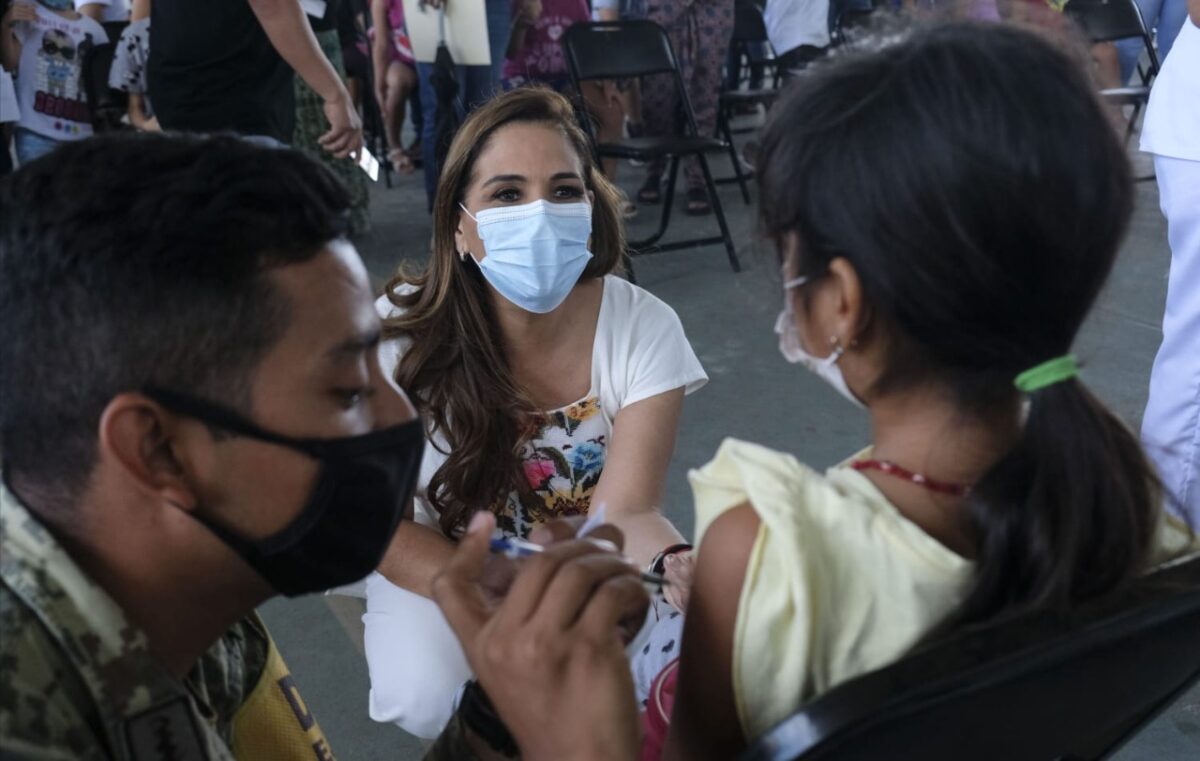 La gobernadora Mara Lezama estuvo hoy en el módulo de vacunación contra la covid-19, ubicado en el parque “Las Casitas”, donde recorrió el lugar, platicó con los padres de familia y saludó a los pequeños que acudieron a la aplicación de sus dosis.