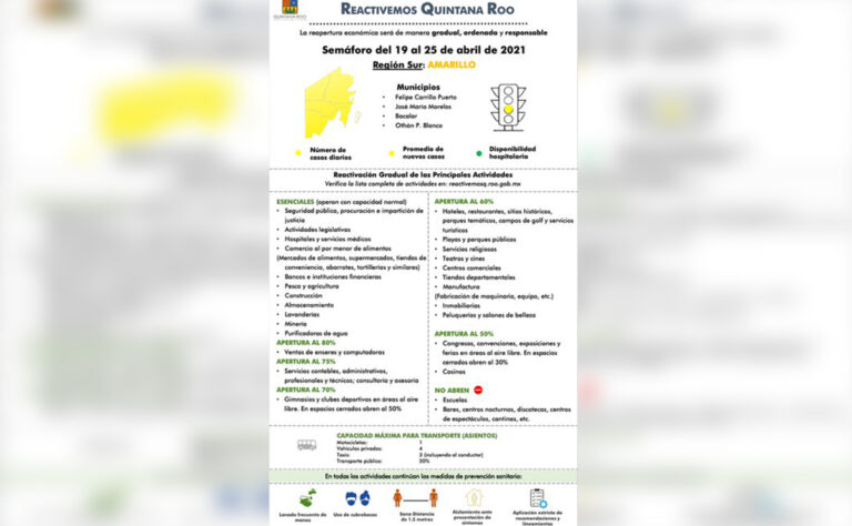 En un post de twiter el mandatario estatal expresó que «De norte a sur el SemáforoEstatal marca amarillo del 19 al 25 de abril. Estas dos últimas semanas hemos recibido más de 232 mil turistas internacionales. Esto provoca mayores riesgos y mayor necesidad de cuidarnos con los hábitos. ¡No bajemos la guardia!