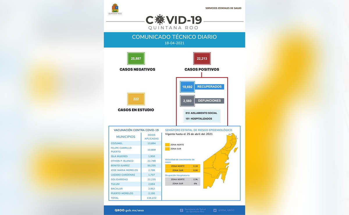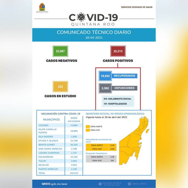 Las autoridades sanitarias en Quintana Roo informaron que hasta el momento ya son 22 mil 213 casos positivos por el Covid-19.