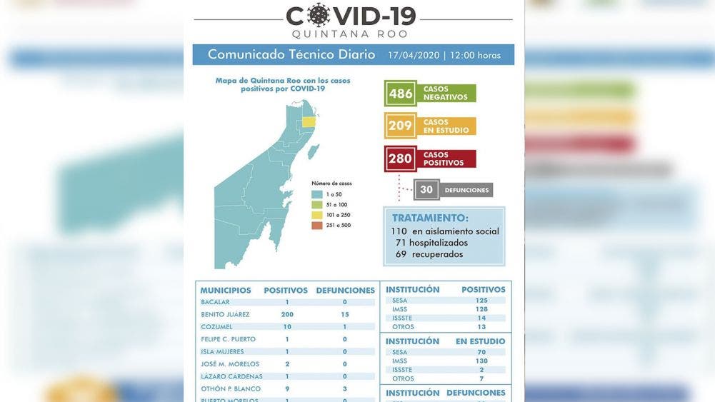 Ya son 30 defunciones y 280 casos por Coronavirus en Quintana Roo.- La Secretaría de Salud en Q. Roo, reporta al corte de este 17 de abril 280 confirmados de COVID 19 y 30 defunciones por este virus, es decir sólo incrementó un positivo y 2 defunciones en 24 horas, siendo Benito Juárez, el municipio que se mantiene a la cabeza con 200 contagios y 15 muertes, mientras que Solidaridad tiene 50 confirmados y suma una defunción más con lo que alcanza 9, le sigue Cozumel con 10 casos positivos y quien suma su primera muerte por esta causa, Othón P. Blanco se mantiene con 9 confirmados y 3 defunciones, JMM tiene 2 positivos, Tulum 4 y 2 decesos, mientras que el resto de los municipios tienen un caso cada uno.