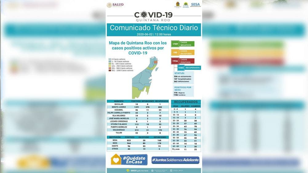 La Secretaría de Salud informó que, al corte de este 2 de junio, se reportan 30 contagios más de COVID 19, así como 9 defunciones por esta causa, todas ellas en Benito Juárez, haciendo un acumulado en el estado de mil 956 casos positivos, mil 80 recuperados, 513 casos activos de los que 356 están en aislamiento social, y 157 en hospitalización, así como 363 defunciones en lo que va de la contingencia sanitaria.