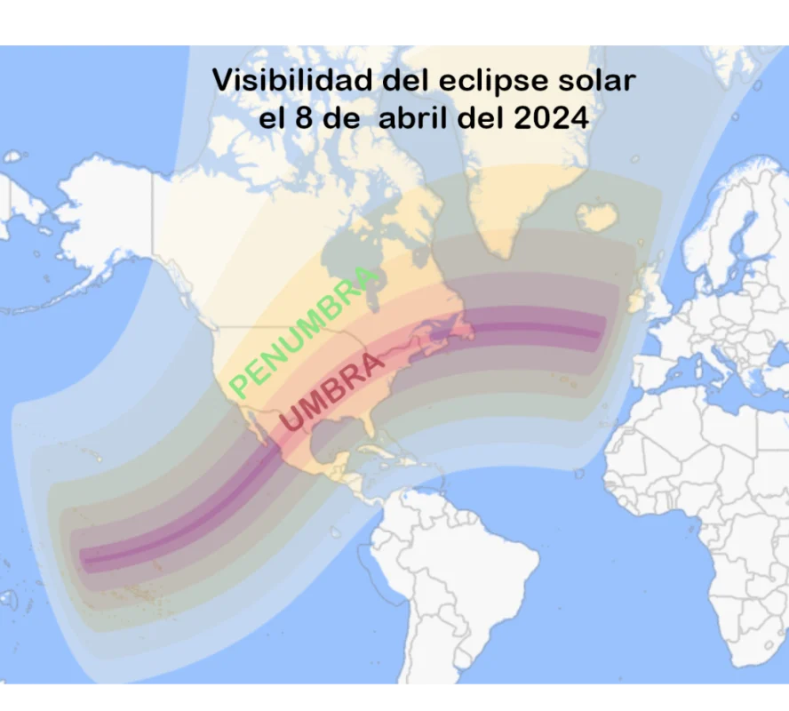 Este fenómeno natural podrá observarse en el norte del Océano Pacífico, luego atravesará el norte de México, viajará por el este de Estados Unidos y Canadá y al final visitará el Océano Atlántico. Mientras que toda Centroamérica y casi toda América del Norte podrán observar el eclipse de manera parcial.