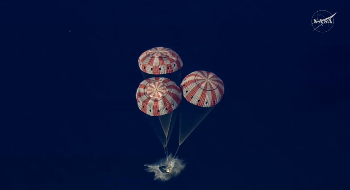 Con precisión quirúrgica, los paracaídas se abrieron, la velocidad se redujo y, a las 8:07 p.m. (hora del Este), la cápsula tocó las olas del Pacífico como un ave que regresa al nido. Helicópteros de la Marina estadounidense y equipos de recuperación de NASA la rodearon en minutos.