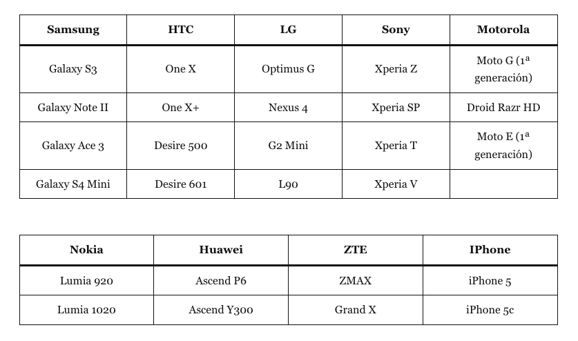 - Motorola: Moto G (1ª generación), Droid Razr HD, Moto E (1ª generación).