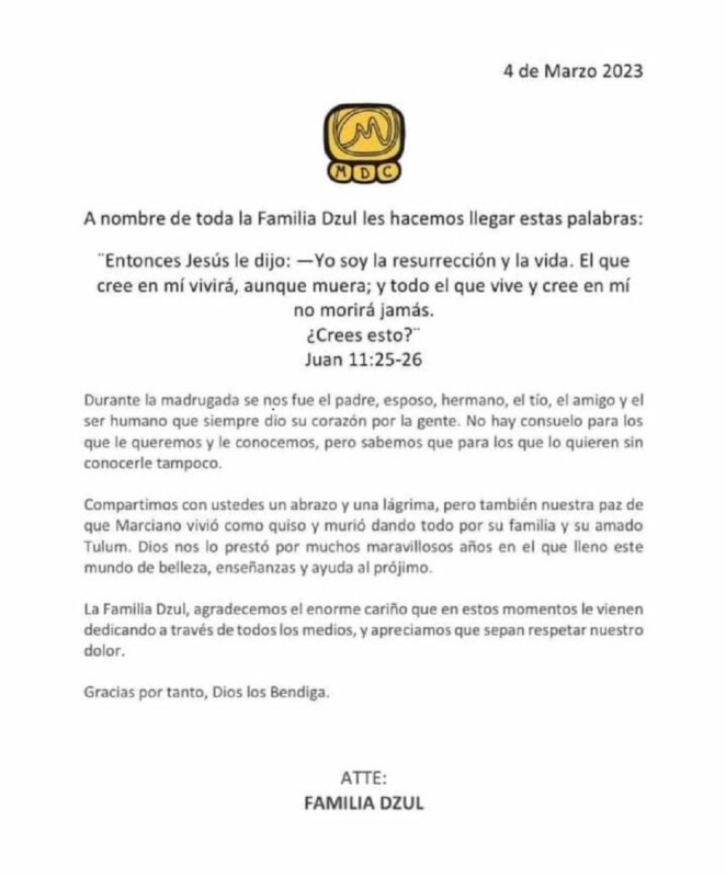 “Compartimos con ustedes un abrazo y una lágrima, pero también nuestra paz de que Marciano vivió como quiso y murió dando todo por su familia y su amado Tulum. Dios nos lo prestó por muchos maravillosos años en el que llenó este mundo de belleza, enseñanzas y ayuda al prójimo.