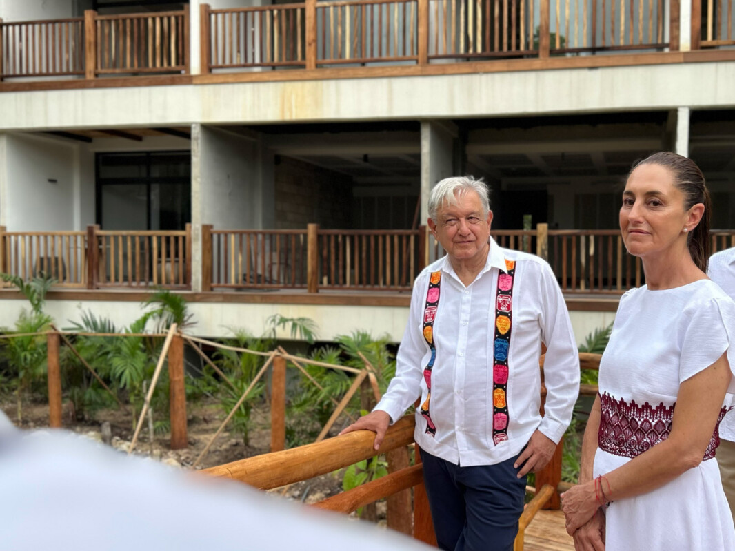 El presidente Andrés Manuel López Obrador y la presidenta electa Claudia Sheinbaum Pardo cortaron el listón inaugural del Hotel Tren Maya Tulum en Quintana Roo.