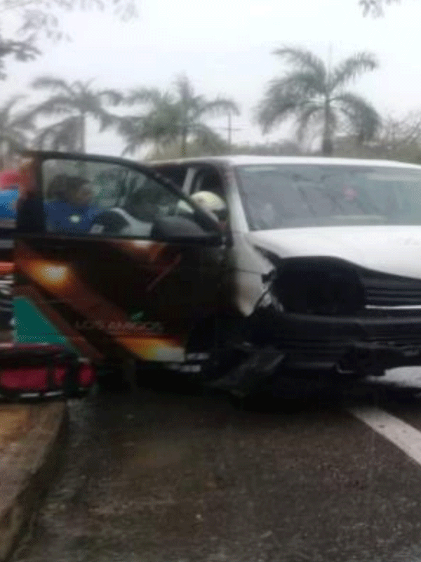 Al no tomar las condiciones resbalosas de la carretera a causa de la lluvia, este conductor perdió el control de volante y se fue a impactar contra una palmera; posteriormente, salió proyectado hacia el carril por donde transitaba una van de transporte de personal de una empresa inmobiliaria de Tulum.