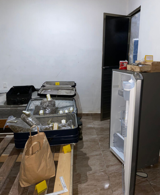 En un segundo inmueble, ubicado en la calle Sol Poniente en el mismo municipio, los agentes de investigación aseguraron bolsas de material sintético con material verde seco similar a la marihuana y detuvieron a Luis “G”.