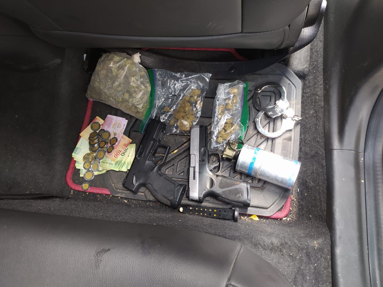 Al proceder a la revisión minuciosa, encontraron en el interior del vehículo dos armas cortas, escuadras automáticas calibre 9 milímetros, con sus respectivos cargadores abastecidos, una granada y unas esposas.