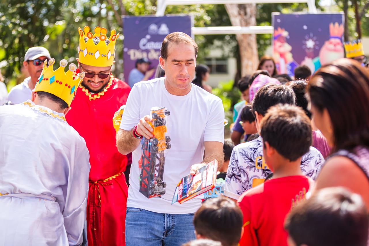 El presidente municipal de Tulum, Diego Castañón Trejo y los tres Reyes Magos, celebraron en grande a la niñez de distintas colonias en la cabecera municipal, generando sonrisas y mucha alegría, y por supuesto, compartiendo con las familias el espíritu de la tradicional rosca.