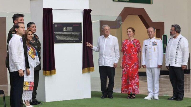 Este medio día fue inaugurada esta terminal aérea, cuya construcción inició en junio de 2022 y será controlada por la empresa Olmeca Maya Mexica (GAFSACOMM) de la Secretaría de la Defensa Nacional (Sedena). Se trata de la primera de una serie de obras públicas que el mandatario inaugurará a lo largo de este mes y que forma parte del corredor del Tren Maya.