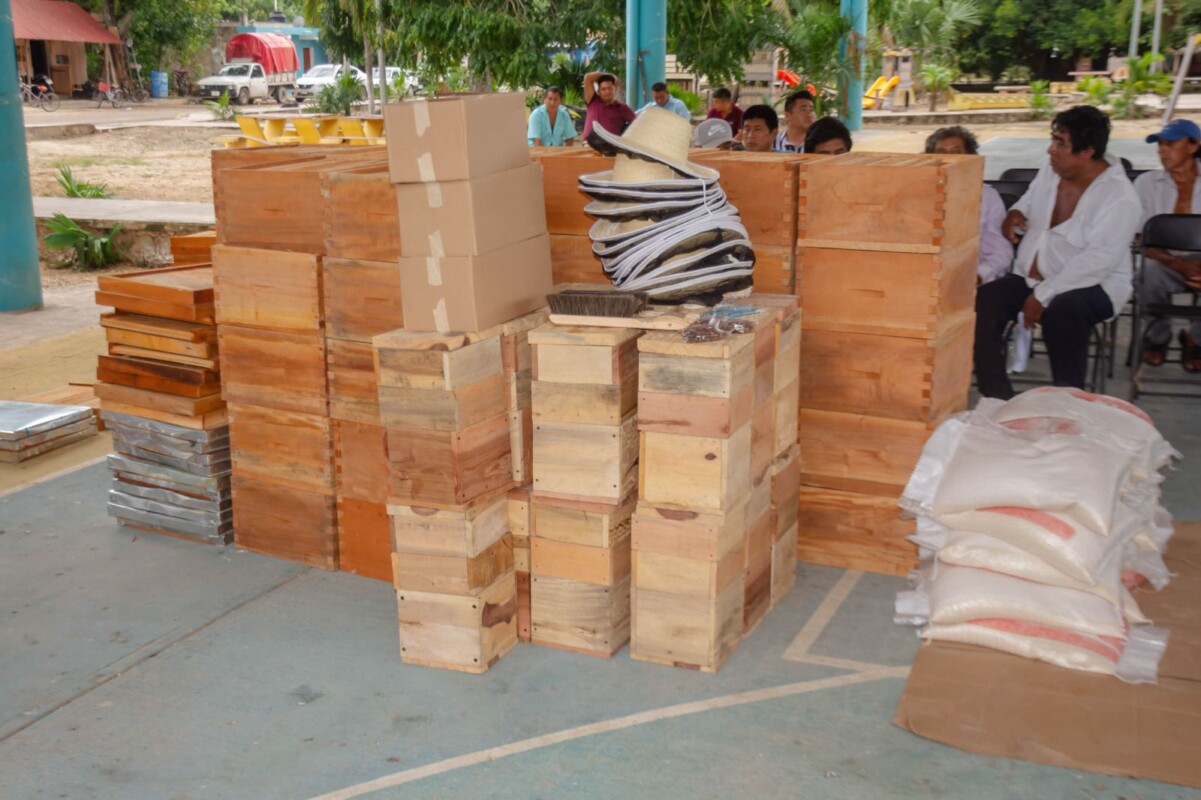 -120 juegos completos (caja, piso, 10 cuadros), 45 velos con sombreros, 1350 copaceldas, 900 ceras estampadas, 45 cepillos desabejador, 120 cajas xunaan kaab, 45 agujas de traslarve, 140 abejas reinas, 10 cámaras de cría, 1050 kilos de azúcar.