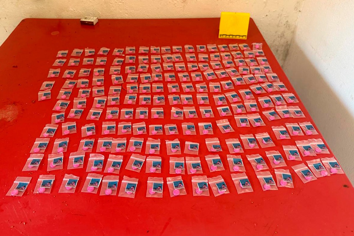 El reporte oficial señala el aseguramiento de hierba verde seca con características similares a la marihuana, pastillas de color rosa que podrían corresponder a una sustancia conocida como LSD, además de dos armas de fuego y básculas grameras, comúnmente utilizadas para la dosificación de narcóticos.