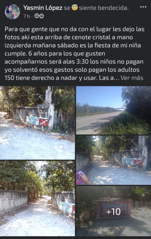 Asimismo, finalizó su texto con la explicación de como llegar al lugar «Para que gente que no da con el lugar les dejo las fotos aki esta arriba de cenote cristal a mano izquierda mañana sábado es la fiesta de mi niña cumple. 6 años para los que gusten acompañarnos será alas 3:30».