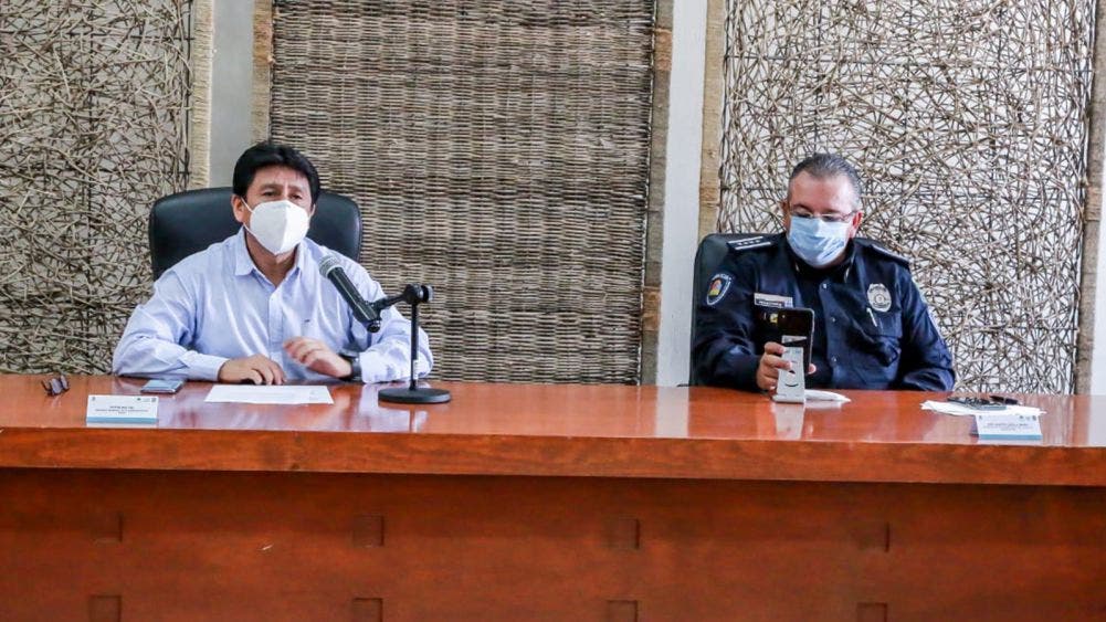 Obligatorio el uso de cubrebocas en espacios públicos: Víctor Mas.- En conferencia de prensa con el secretario de Seguridad Pública, Alberto Capella Ibarra, el presidente, Víctor Mas Tah, anunció que, en la primera sesión virtual de Cabildo, transmitida por redes sociales, se acordaron medidas para contener y detener el crecimiento acelerado de contagios en este destino turístico, haciendo obligatorio el uso de cubre boca en el espacio público.