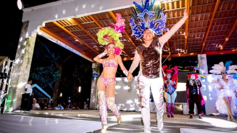 Posteriormente, correspondió la participación de la comparsa integrada por Perla Anahis Xul Fernández y Elmer FelipeYam Uc, procedentes de la comunidad de Akumal, quienes junto con sus bailarines, presentaron una hermosa rutina que generó una gran cantidad de aplausos de los tulumnenses, así como de los turistas nacionales y extranjeros reunidos en el corazón de Tulum, el Parque Museo de la Cultura Maya.