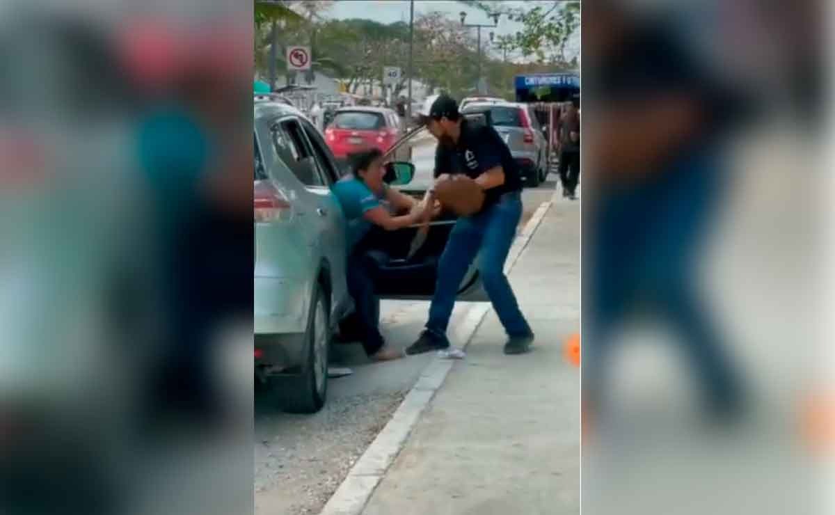 En las imágenes se puede observar a Olof que quiere quitarle el bolso a una mujer, misma que está dentro de un vehículo.