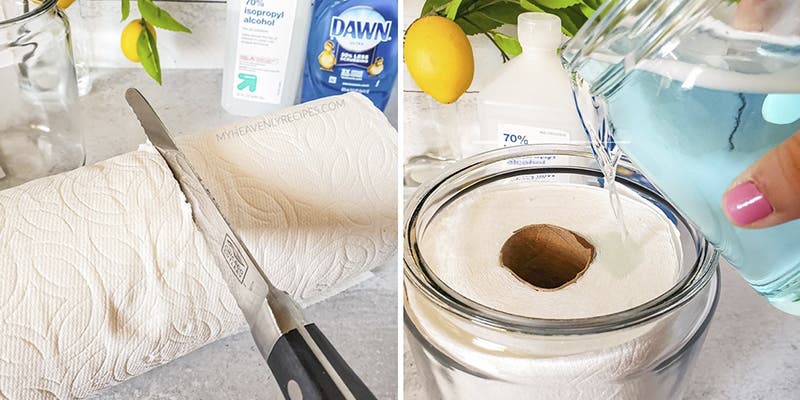 - De preferencia busca un recipiente con forma cilíndrica y enrolla las toallas, ajústalas bien, una vez que las acomodaste en el recipiente que escogiste, vacía la mezcla que hiciste sobre ellas y asegúrate que todas se humedezcan de este líquido.